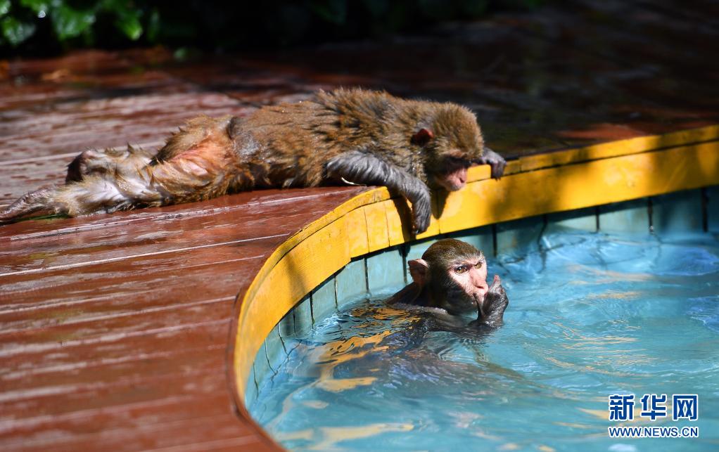 4月4日,獼猴在南灣猴島保護區里戲水。