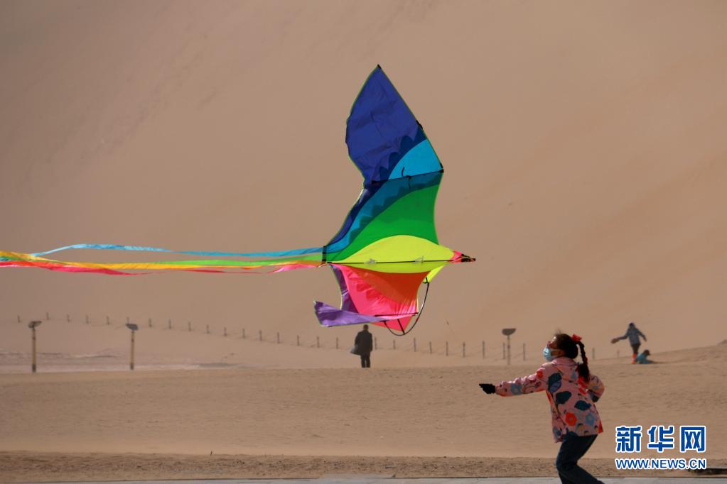4月5日,小朋友在甘肅省敦煌市鳴沙山月牙泉景區山門廣場放風箏。