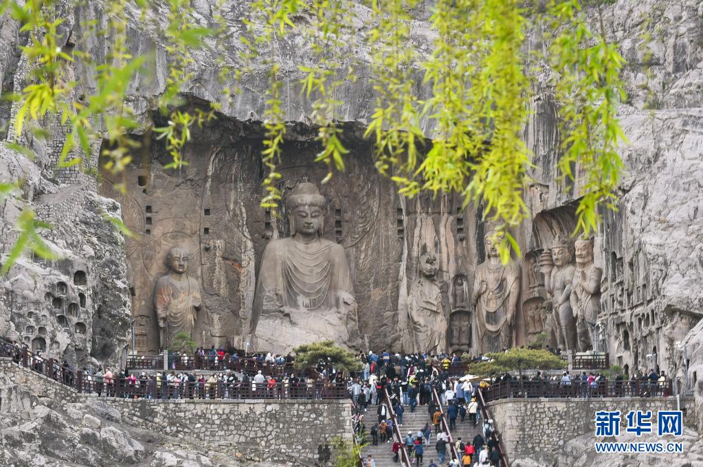 4月4日,游客在位于河南洛陽的龍門石窟景區內參觀游覽。