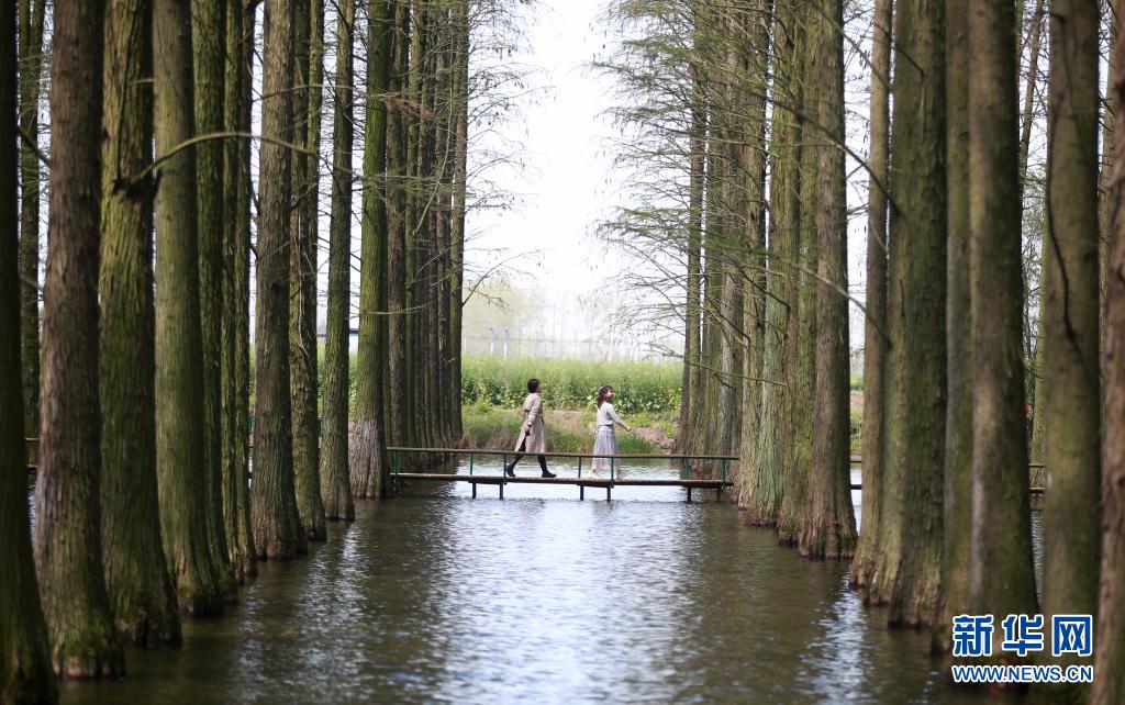 4月5日,在江蘇省揚州市淥洋湖濕地公園,游客在水上森林中游覽。