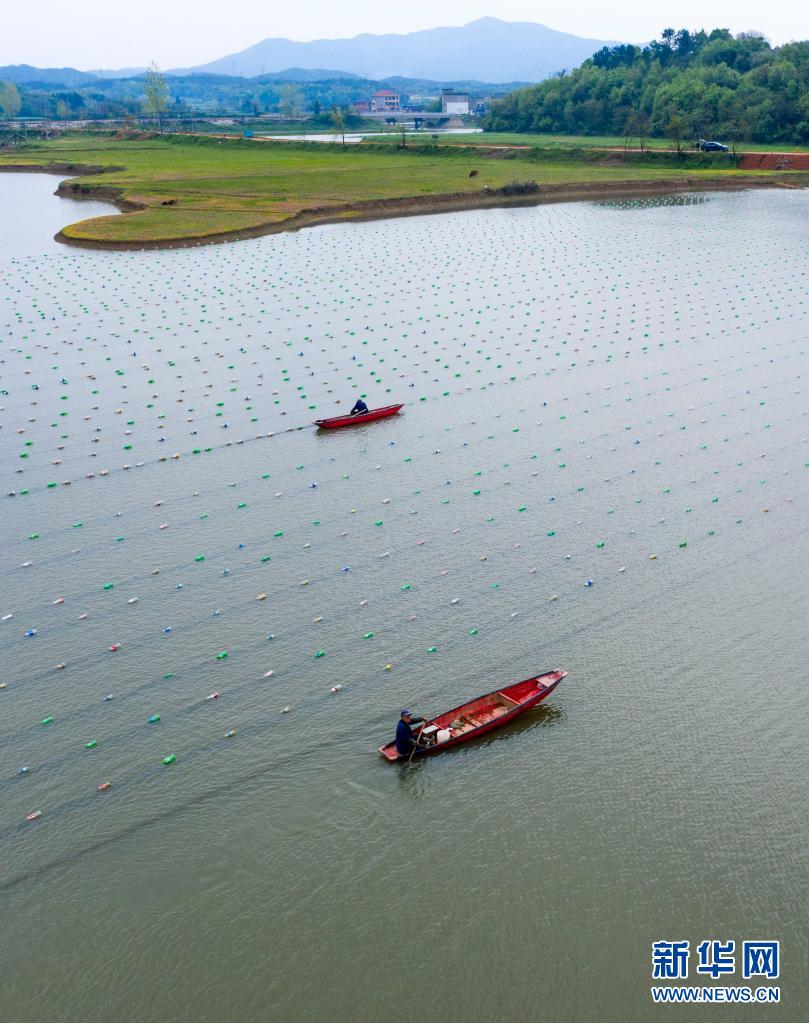 4月6日,在江西省九江市都昌縣新妙湖畔珍珠養殖基地,蚌農在投放珍珠蚌(無人機照片)。