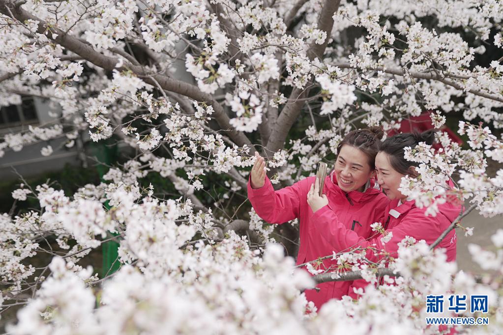 3月13日,武漢雷神山醫院醫護人員在櫻花樹下賞花。當日,武漢大學抗疫醫護人員賞櫻專場啟動,來自全國各地的援鄂抗疫英雄在櫻花樹下重逢,盡享櫻花之約。新華社記者 熊琦 攝