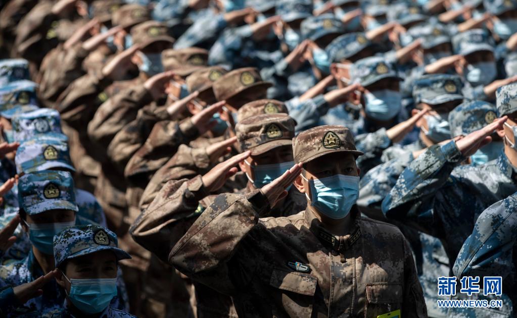 2020年4月15日,最后一批回撤的軍隊支援湖北醫療隊隊員向火神山醫院敬禮告別。新華社記者 費茂華 攝