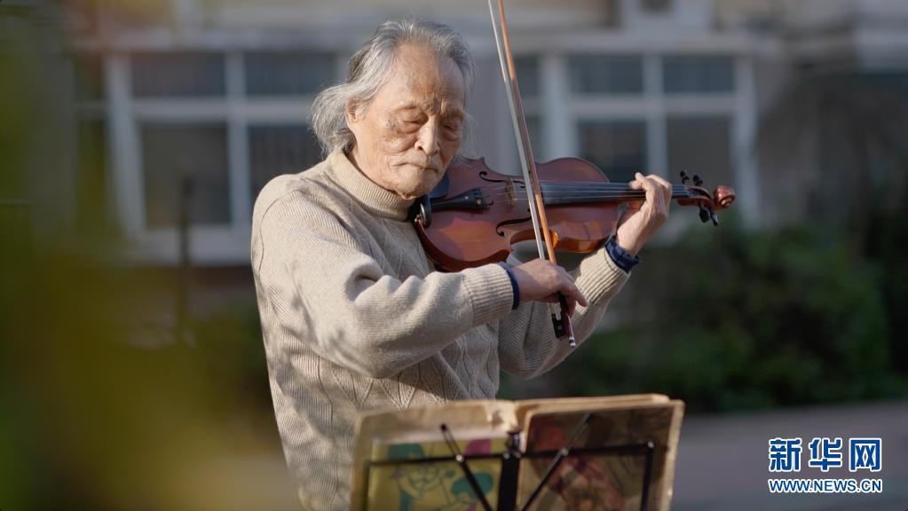 3月24日,“看夕陽的老人”王欣在東西湖區園藝花城小區內拉小提琴。新華社記者 熊琦 攝