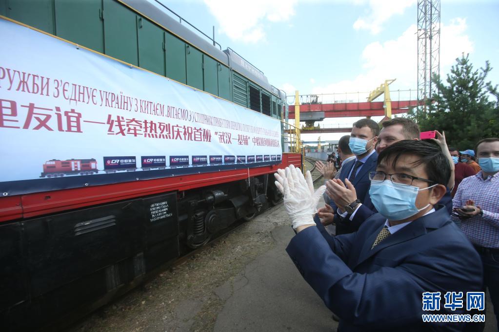 2020年7月6日,在烏克蘭首都基輔市利斯基貨運站,中烏兩國代表迎接“武漢—基輔”中歐班列。該班列是中國華中地區首列直達烏克蘭的中歐班列。新華社發(謝爾蓋·斯塔拉斯堅科攝)