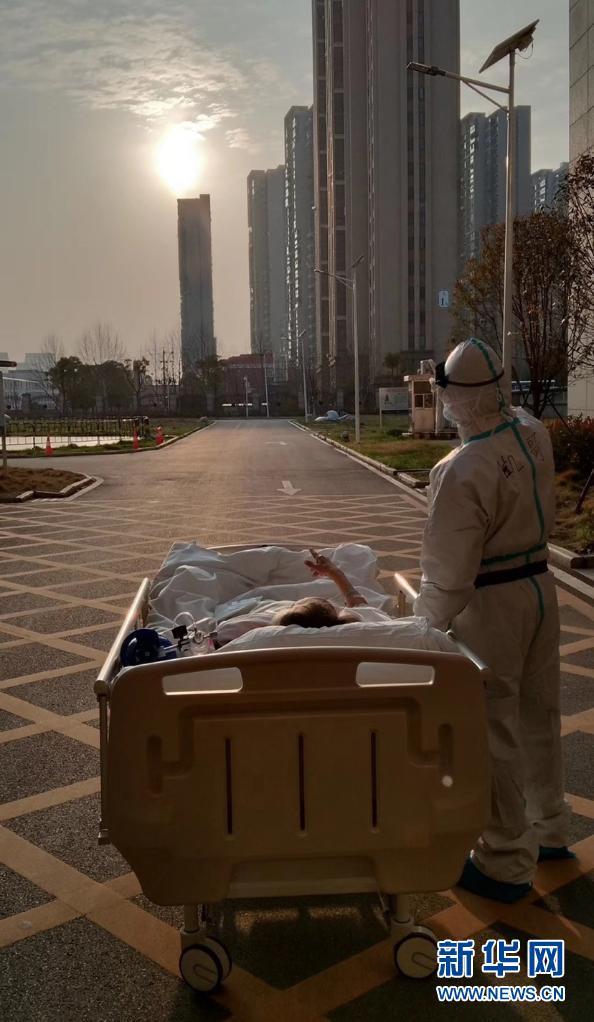 2020年3月5日傍晚,在湖北省武漢大學人民醫院東院,復旦大學附屬中山醫院支援湖北醫療隊醫生在護送患者王欣做CT的途中停下,讓住院近一個月的老人欣賞久違的日落。新華社發(甘俊超 攝)