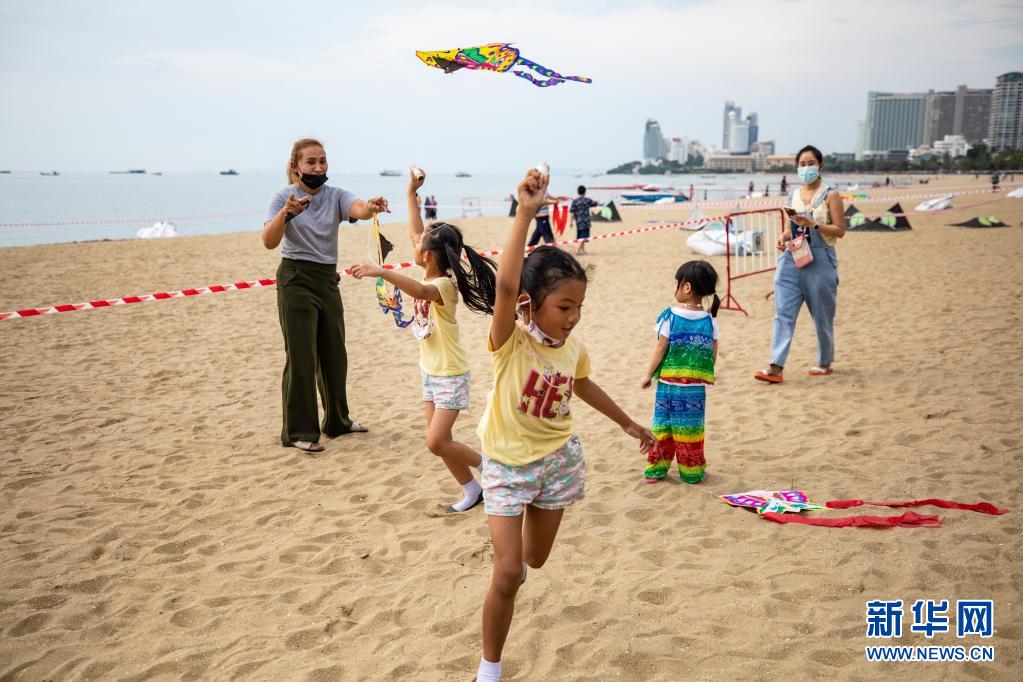 4月9日,兒童在泰國芭堤雅海灘上放風箏。