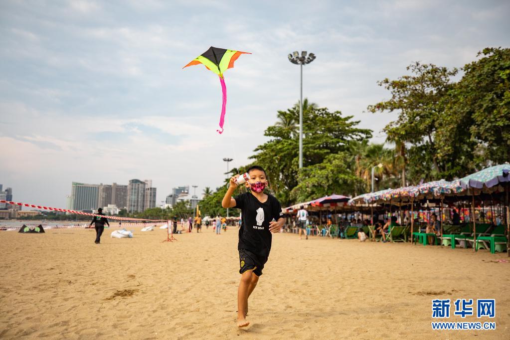 4月9日,一名兒童在泰國芭堤雅海灘上放風(fēng)箏。