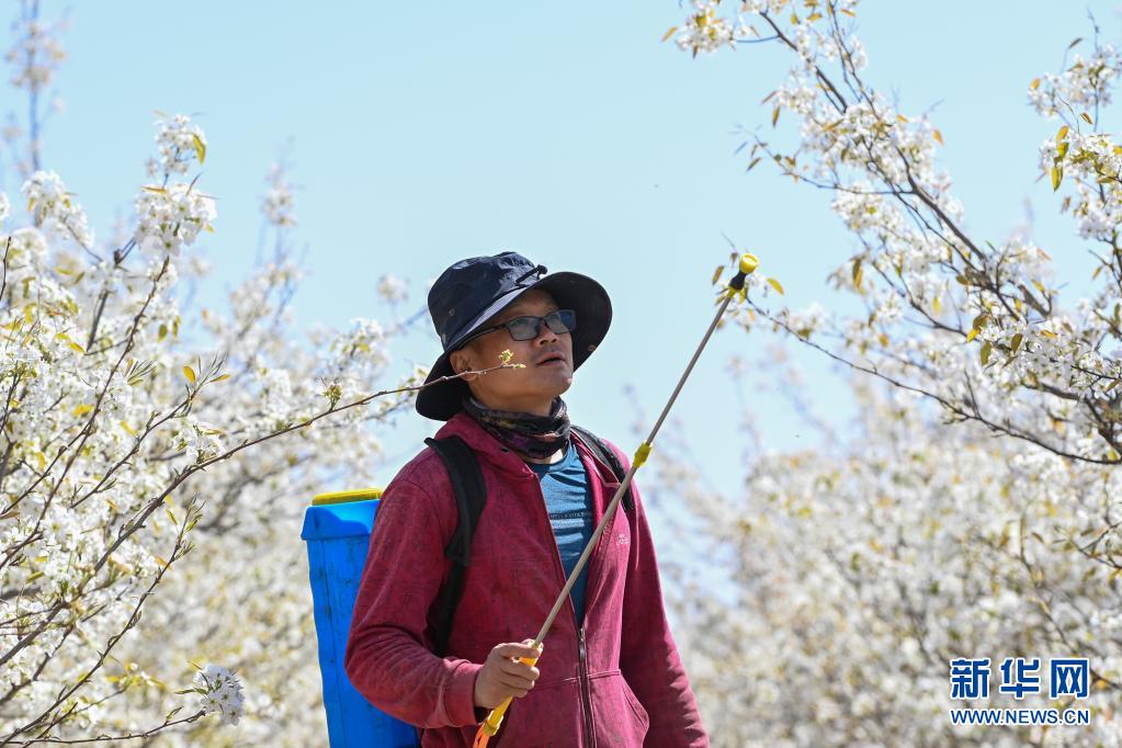 4月11日,在鐵門關市一處梨園,梨農為梨花授粉。新華社記者 丁磊 攝