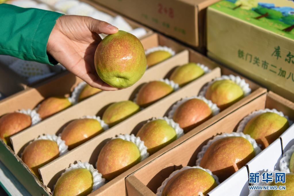 4月11日,在鐵門關市一處香梨示范園,果農展示庫爾勒香梨。新華社記者 丁磊 攝