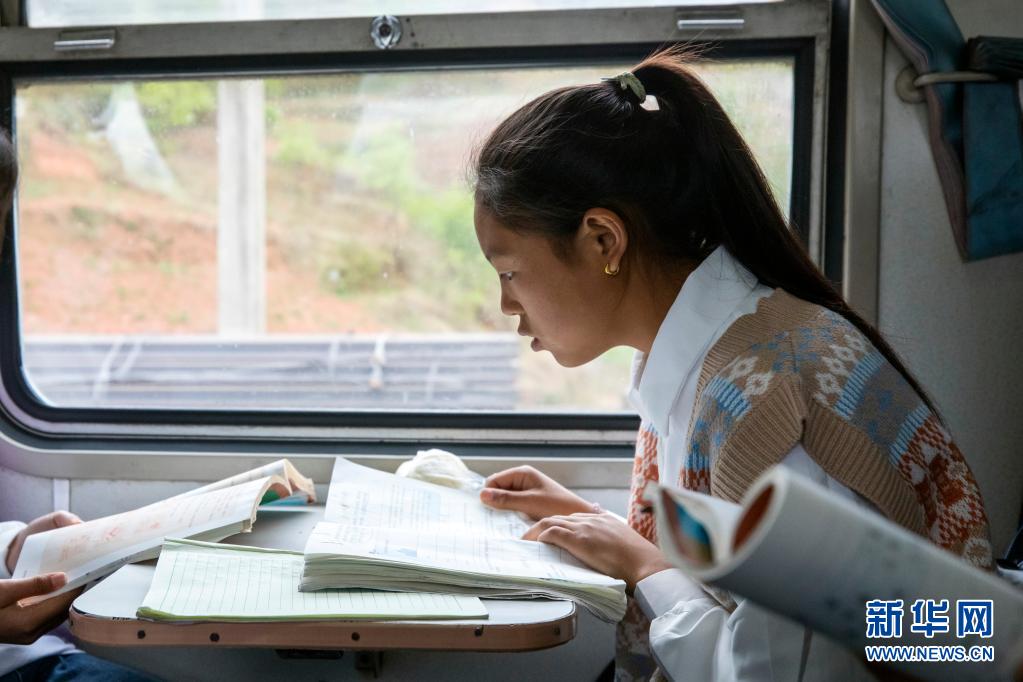 在乘坐5633次列車從家返校途中,一名學生在復習功課(4月11日攝)。新華社記者 沈伯韓 攝
