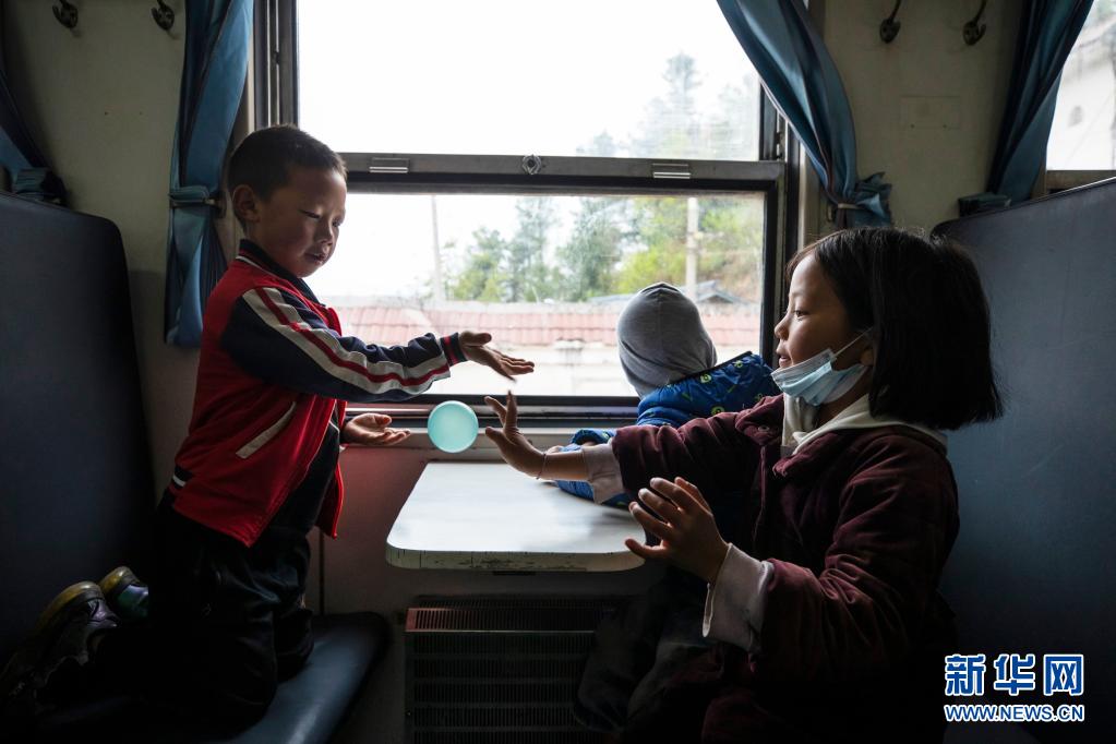 兩名小乘客乘坐5633次列車去外地上學(xué)(4月11日攝)。新華社記者 沈伯韓 攝