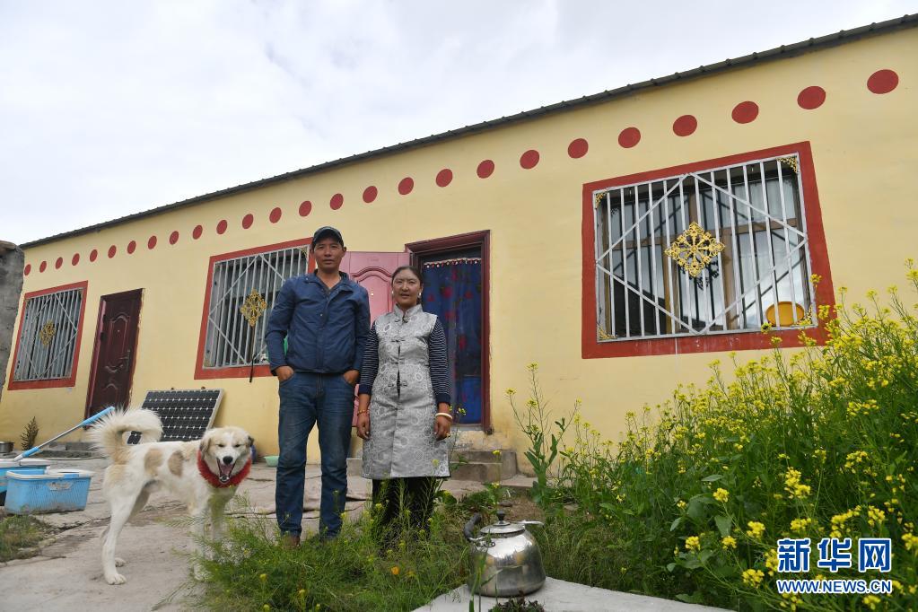 在青海省玉樹藏族自治州治多縣治渠鄉同卡村,村民昂文西讓和妻子布沙措江卓瑪站在易地搬遷的新家院子里合影(2019年9月12日攝)。