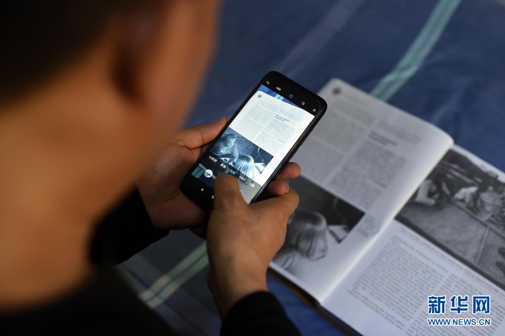 包珍妮無法正常閱讀紙質書籍,父親包宗鋒將書的內容分頁拍照供她在電腦上學習(4月14日攝)。
