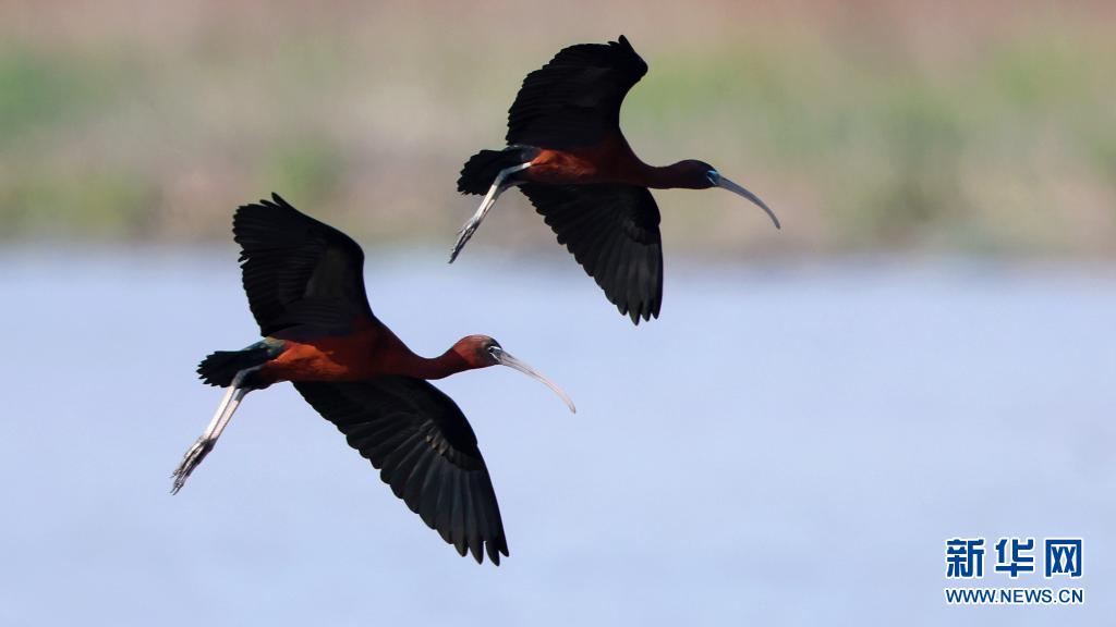 彩鹮在福建省霞浦縣福寧灣灘涂上空飛翔(4月17日攝)。一對彩鹮近日現身福建省霞浦縣福寧灣灘涂的視頻,經當地媒體播發后引起轟動,各地攝影師及當地生態保護志愿者紛至沓來,一睹它們的“芳容”。新華社記者 梅永存攝