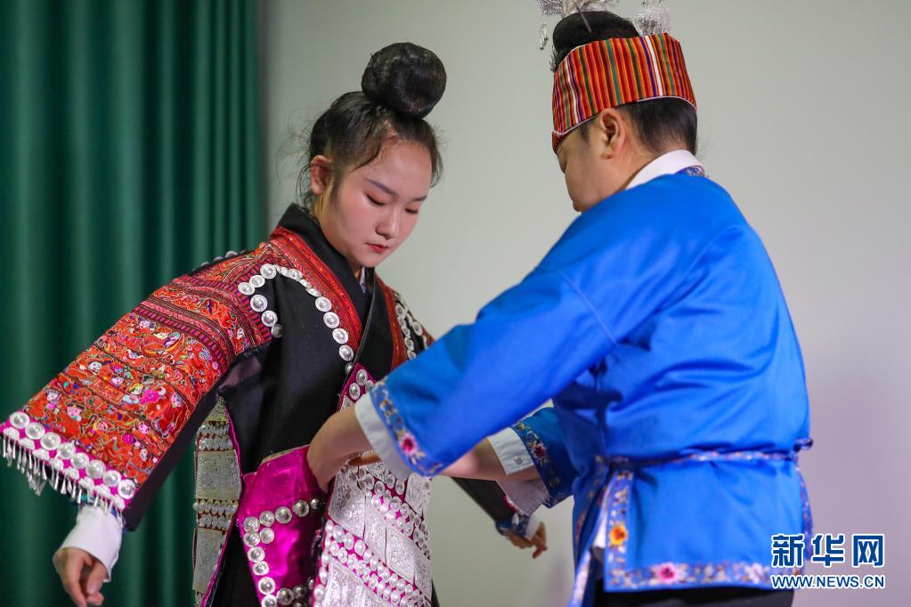 4月25日,張佳麗(左)在母親張元英的幫助下穿上苗族盛裝。