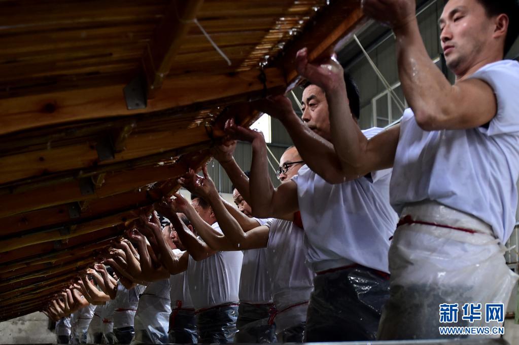 近日,在宣紙產地安徽省宣城市涇縣,“四丈宣紙”的抄制在一家紙業有限公司啟動。50余名撈紙師傅操作巨型紙簾,齊心協力,在紙槽旁進行撈紙作業。來回起落兩次,動作整齊劃一。隨后工人們將紙簾吊起放至一邊揭下,一張巨大的宣紙便撈制成功。經過曬、剪等工序后, 制成長13.2米、寬3.6米的巨型宣紙就是“四丈宣紙”。