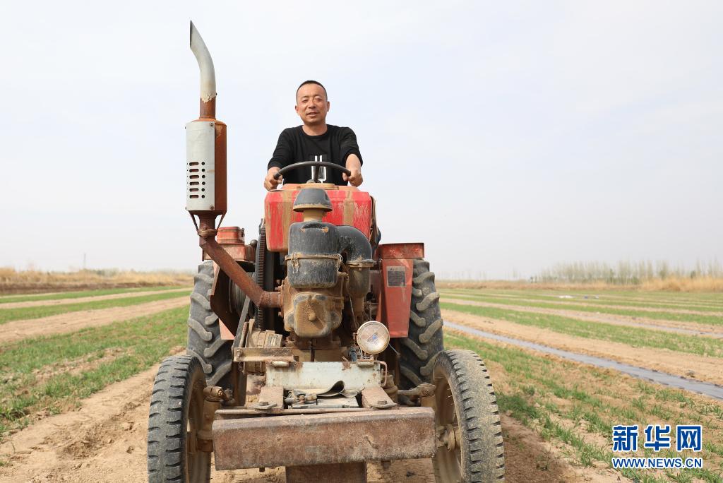 4月25日,內蒙古巴彥淖爾市臨河農場種糧大戶王如來在麥田套種玉米。新華社記者 李云平 攝