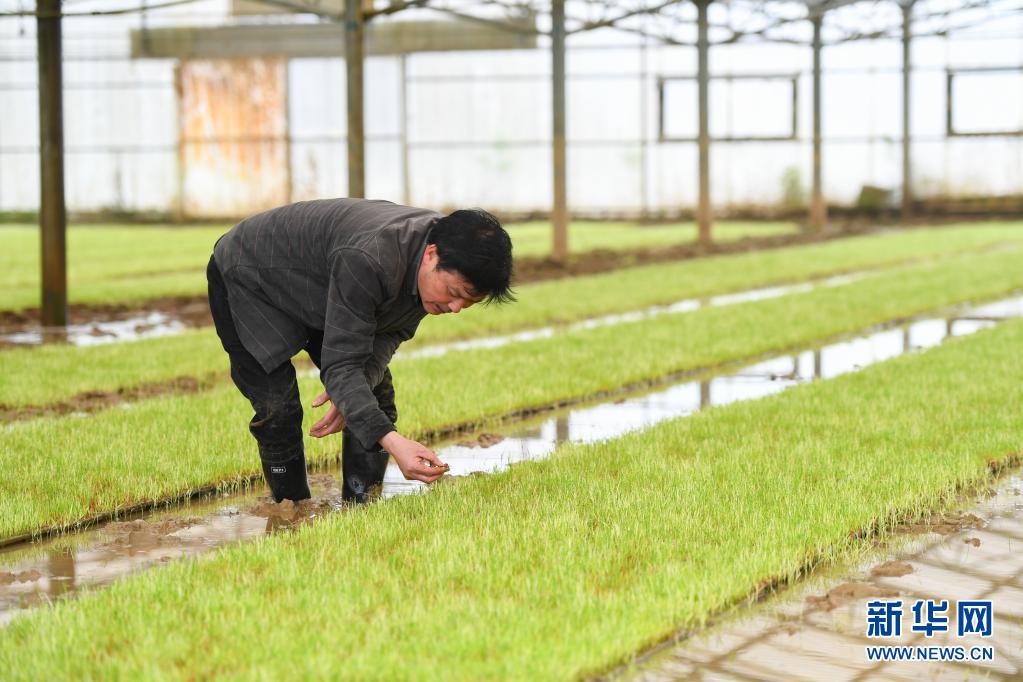 4月12日,在湖南省益陽市赫山區歐江岔鎮牌口村,劉進良在育秧棚里查看秧苗生長情況。新華社記者 陳澤國 攝
