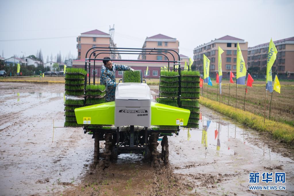 在湖南省益陽市沅江市草尾鎮沅江現代農業技術研發基地,工作人員演示插秧機操作(3月2日攝)。新華社記者 陳思汗 攝