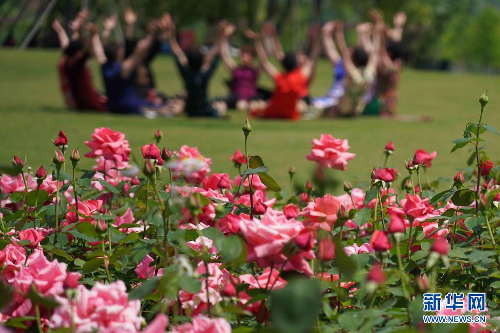 4月26日,市民在杭州濱江白馬湖公園月季園游玩賞花踏青并留影。近日,各地鮮花盛開,吸引人們走出家門踏青賞花。新華社發(莊穎昶 攝)