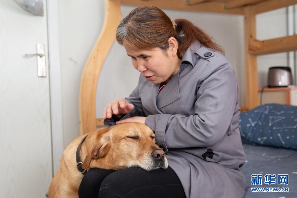 導盲犬“多多”經常會把頭放在祝愛葉腿上,祝愛葉一邊撫摸著它的頭一邊和它說說心里話(4月26日攝)。  新華社發 (張夢 攝)