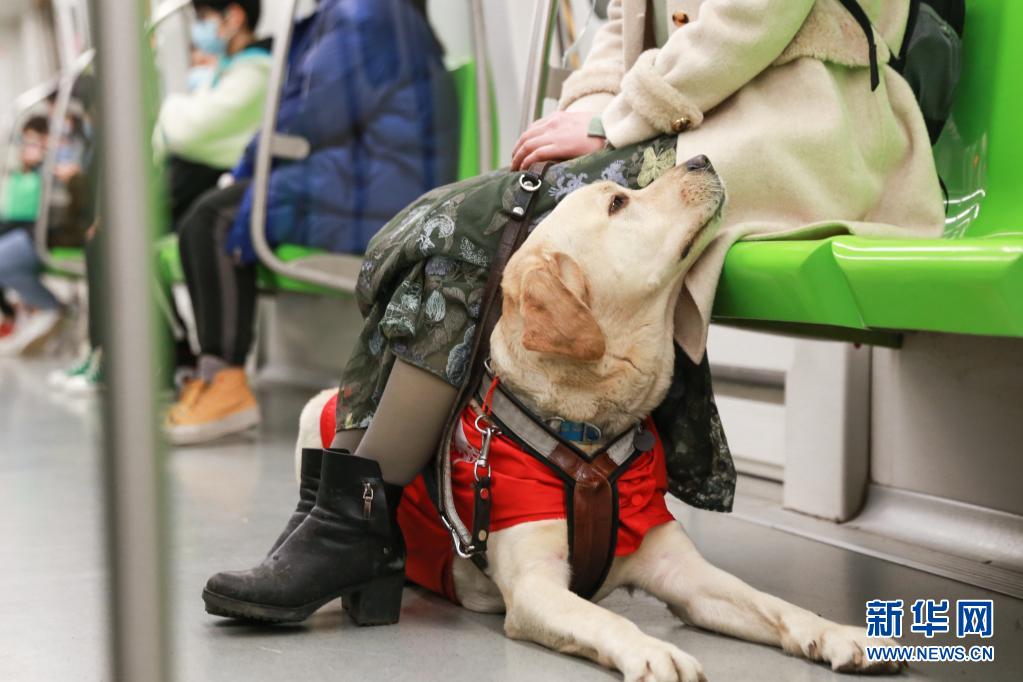 導盲犬“Bingo”陪伴李靜乘坐地鐵(3月27日攝)。  新華社發 (張夢 攝)