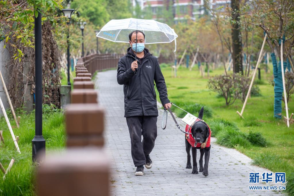 吳虎剛今年45歲,和同是盲人的妻子經營著一家盲人推拿診所。每天上班,導盲犬“C羅”都會陪伴吳虎剛從家走到診所(4月11日攝)。  新華社發 (張夢 攝)