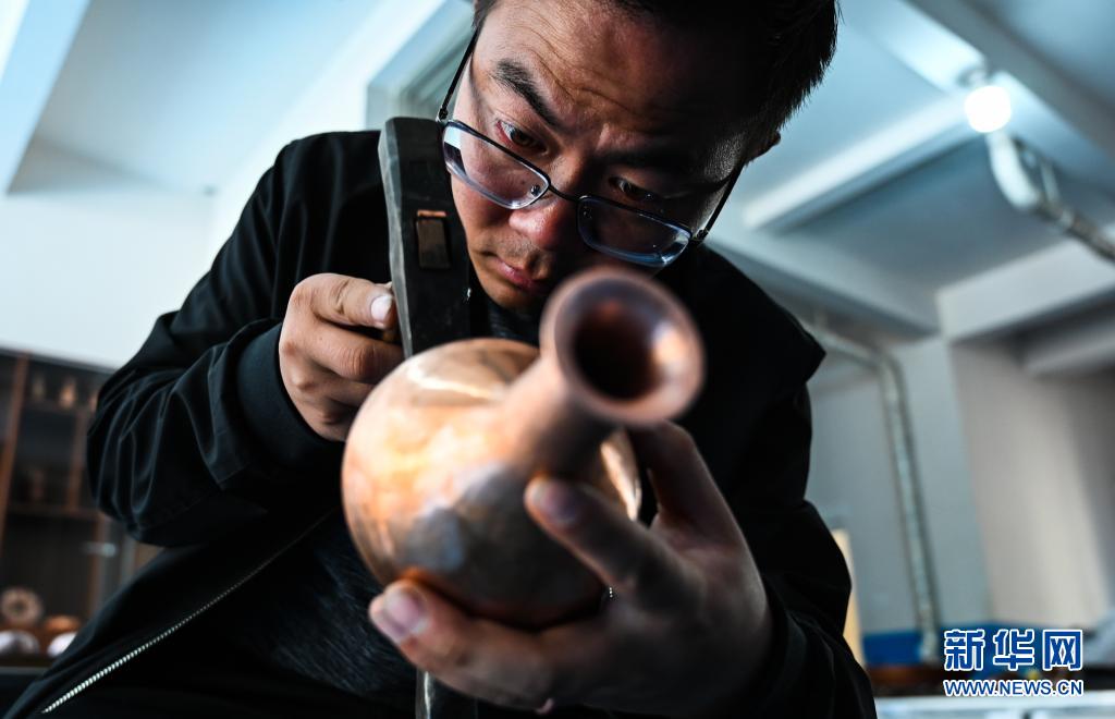 地處滇東北、烏蒙山腹地的云南會澤縣流傳著具有300多年歷史的斑銅制作工藝。斑銅工藝復雜,要采用高品位的銅為原料,經過20余道工序制作而成。產品“妙在有斑,貴在渾厚”,風格獨樹一幟。33歲的張偉是會澤“張氏斑銅”的第十三代傳人。自幼深受地域文化和家庭熏陶的他,大學畢業后,返鄉從事斑銅制作工作。在會澤古城的“銅匠街”,張偉創辦了斑銅傳習館,不斷研發斑銅新產品、傳承著這項非遺技藝。“斑銅是一種情感、一種文化,希望在我們這代人的努力下能夠更好地將它傳承下去,讓更多人了解斑銅的獨特魅力。”張偉說。