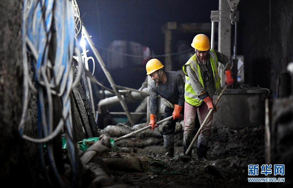 5月1日,在陜西西安地鐵八號線豐禾路站1號豎井施工現場,中鐵七局的工作人員在作業。