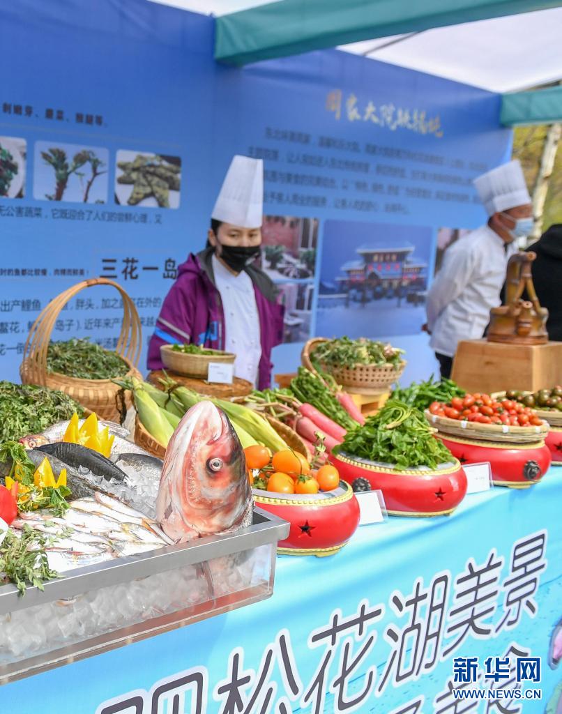 5月1日,在吉林市萬科松花湖度假區夏季運營啟幕儀式現場,廚師展示開江魚和山野菜等當地特色美食。