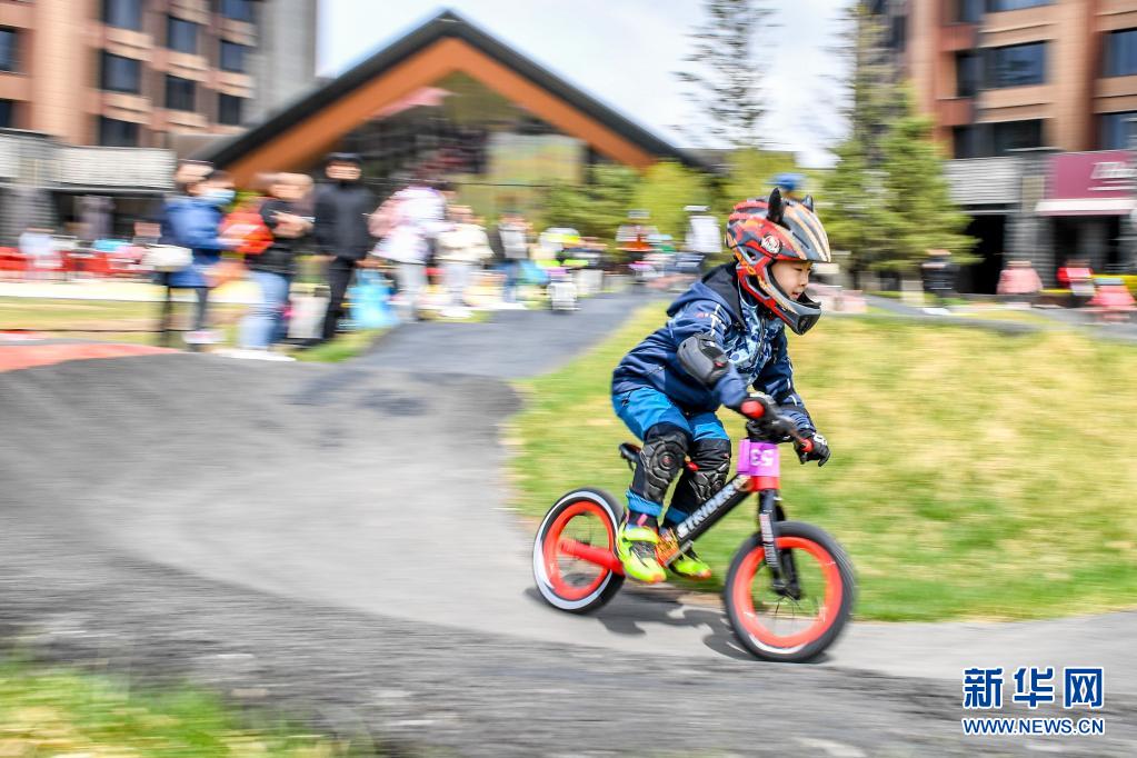 5月1日,在吉林市萬科松花湖度假區(qū),小朋友參加滑步車比賽。