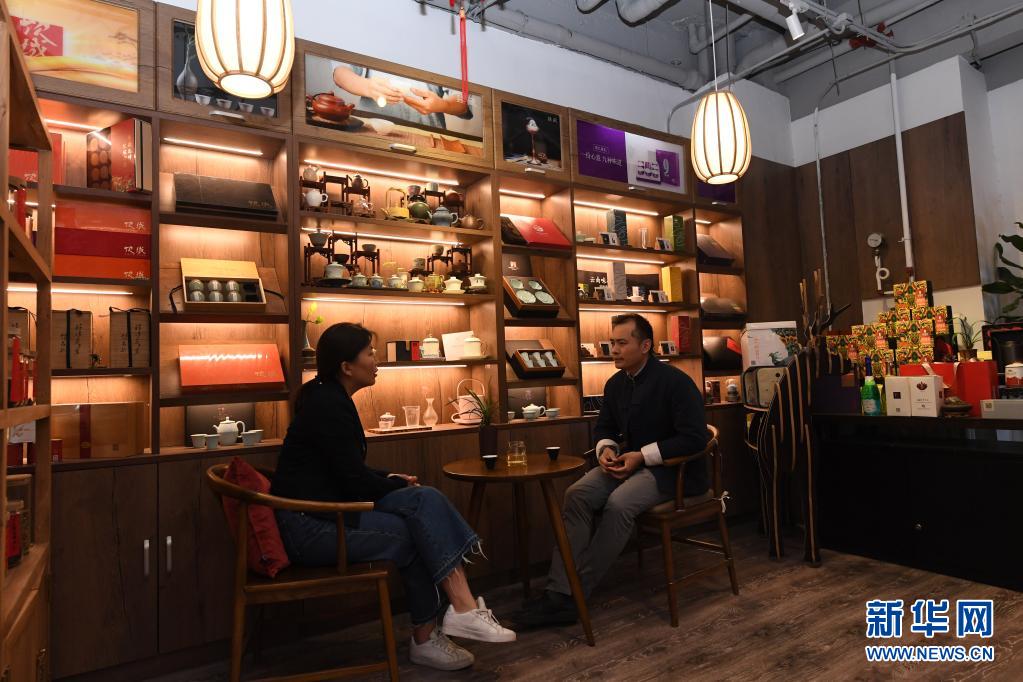 李卓澄(右)在“小茶館”中與客人交流(4月29日攝)。新華社記者 趙婷婷 攝