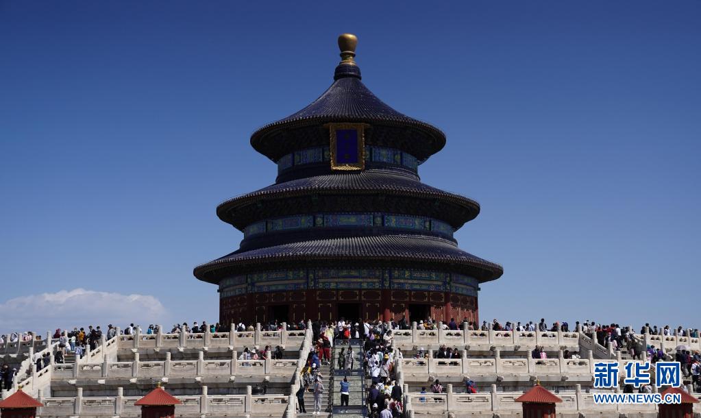 5月4日,游客在天壇公園祈年殿前參觀游覽。