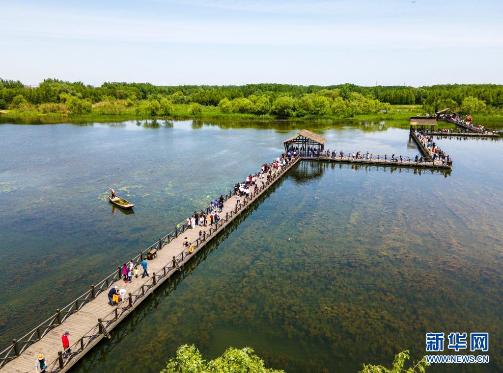 5月2日,游客在江蘇省泰州市姜堰區(qū)溱湖國(guó)家濕地公園棧道上游覽(無人機(jī)照片)。新華社發(fā)(顧繼紅 攝)