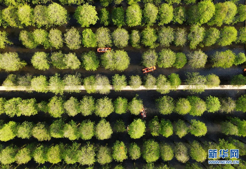 5月3日,在江蘇省揚州市淥洋湖濕地公園,游客在水上森林劃船游玩(無人機照片)。新華社發(fā)(孟德龍 攝)