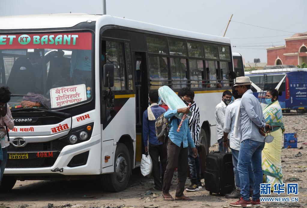 5月5日,印度比哈爾邦宣布實施封鎖措施后,人們在印度巴特那汽車站準(zhǔn)備乘坐巴士返回家鄉(xiāng)。