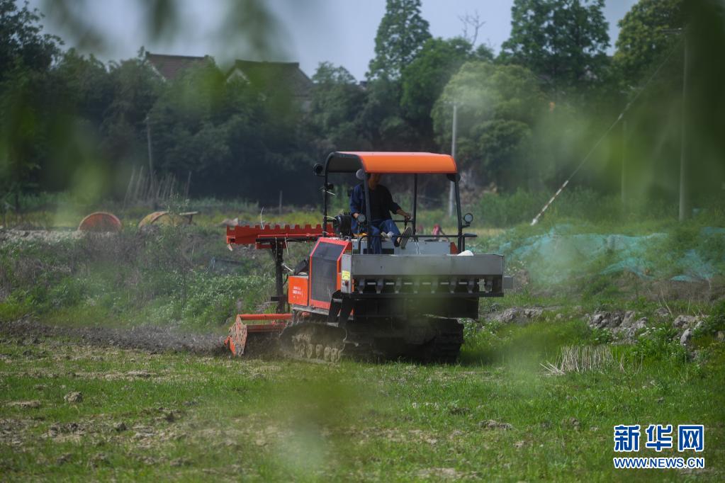 在東林鎮(zhèn)保永村,種植戶操作旋耕機(jī)耕地,準(zhǔn)備播種水稻(5月7日攝)。