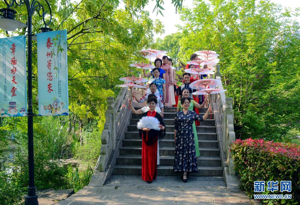 5月9日,江蘇泰州旗袍協會組織數十位媽媽在鳳城河景區進行旗袍秀。