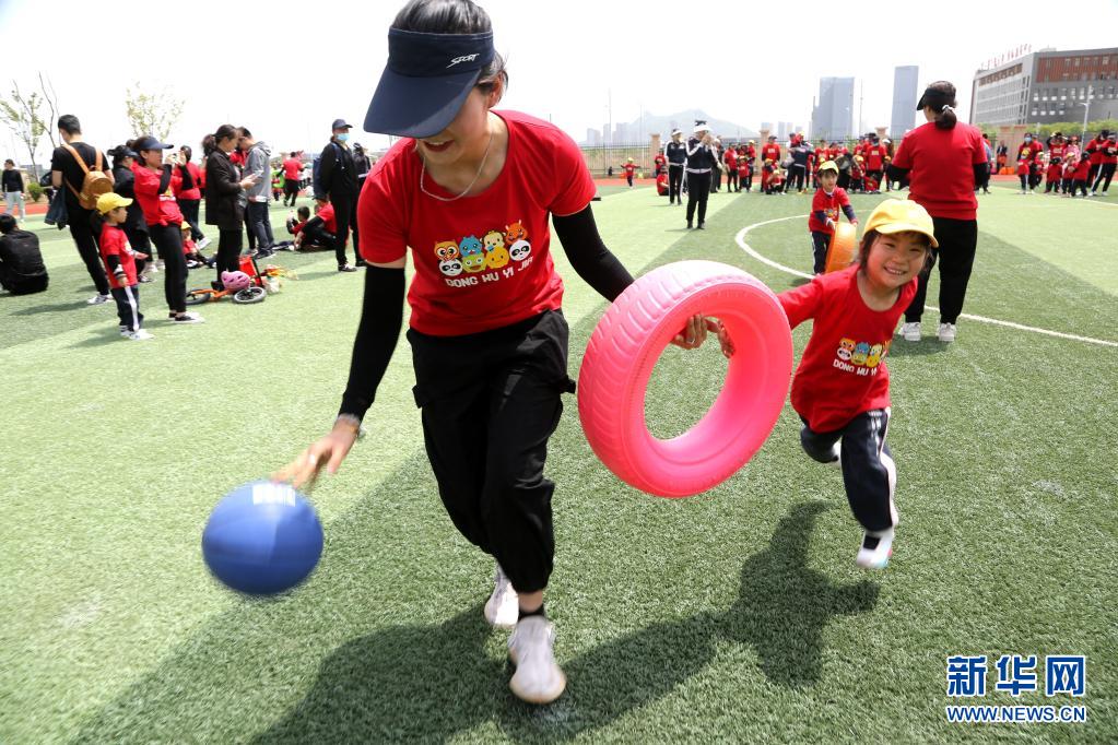 5月9日,在江蘇連云港一所幼兒園的母親節親子活動中,一名小朋友和母親一起參加比賽。