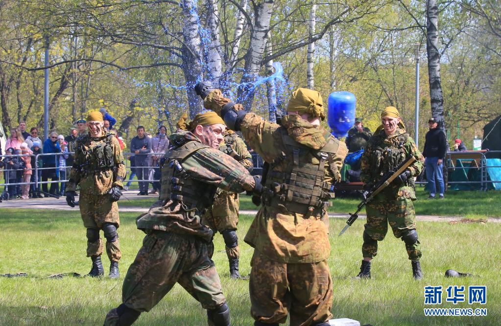 5月9日,軍人在白俄羅斯首都明斯克進(jìn)行勝利日節(jié)慶格斗表演。