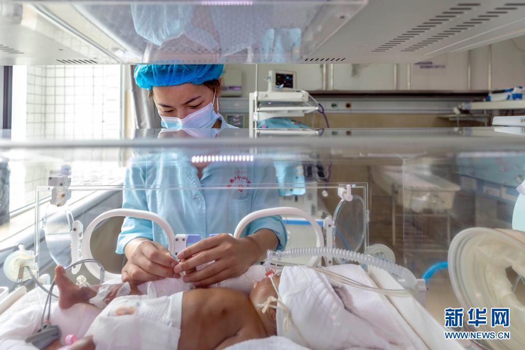 5月11日,護士在貴州省黔西市人民醫院新生兒科為患兒做晨間護理。