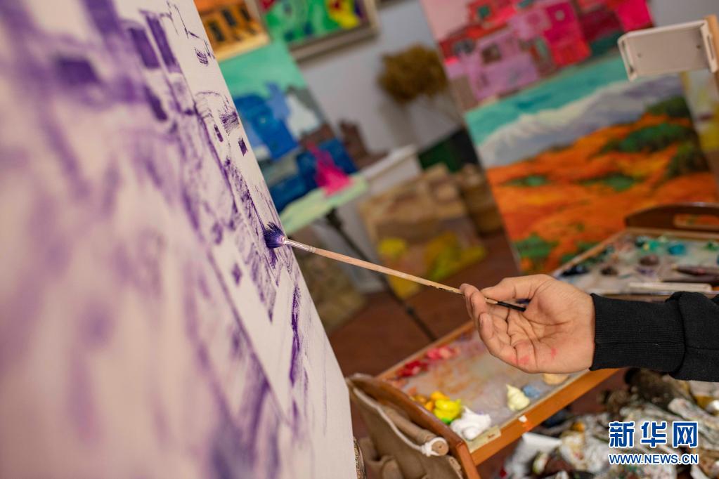 麥麥提吐爾遜江·麥麥提依明在位于新疆喀什古城景區(qū)的工作室內進行創(chuàng)作(5月5日攝)。新華社記者 胡虎虎 攝