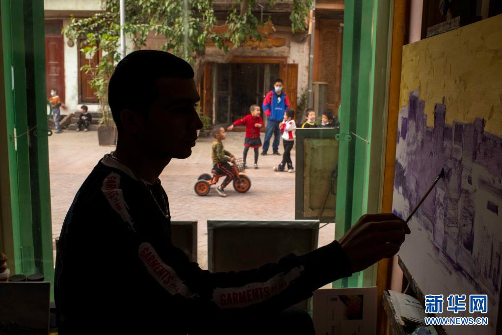 麥麥提吐爾遜江·麥麥提依明在位于新疆喀什古城景區的工作室內進行創作(5月5日攝)。新華社記者 胡虎虎 攝