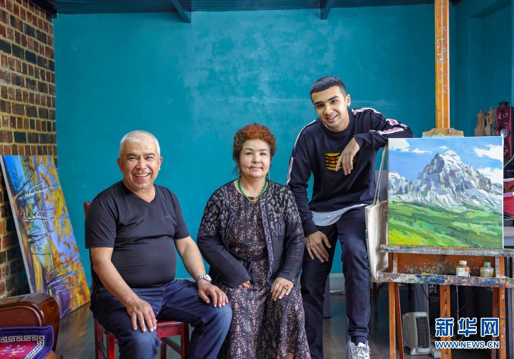麥麥提吐爾遜江·麥麥提依明與父母在家中的畫室合影(5月7日攝)。新華社記者 胡虎虎 攝