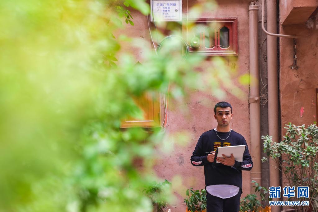 麥麥提吐爾遜江·麥麥提依明在新疆喀什古城景區的小巷內進行速寫創作(5月6日攝)。新華社記者 胡虎虎 攝