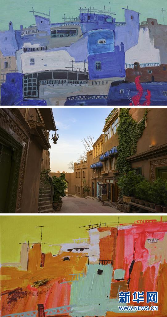 拼版照片:上圖、下圖均為5月8日拍攝的麥麥提吐爾遜江·麥麥提依明關(guān)于喀什老城民居的畫作局部;中圖為5月9日拍攝的新疆喀什古城景區(qū)一角。新華社記者 胡虎虎 攝