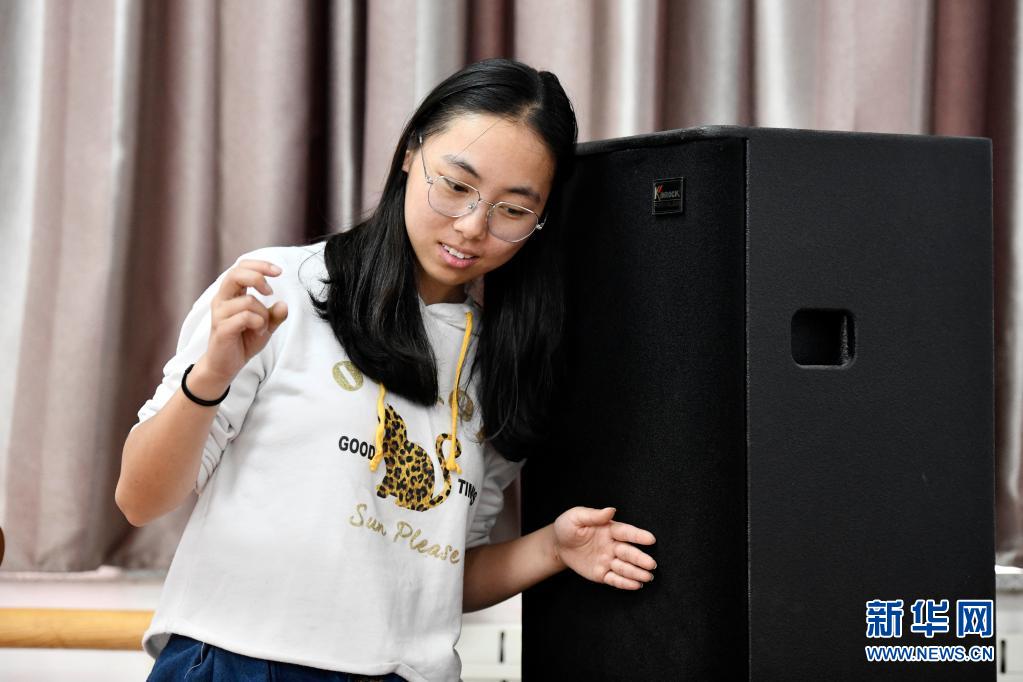 天津理工大學(xué)聾人工學(xué)院聾人舞蹈隊(duì)隊(duì)長(zhǎng)楊凝在排練時(shí)用手接觸音響感受震動(dòng)(5月12日攝)。新華社記者 趙子碩 攝
