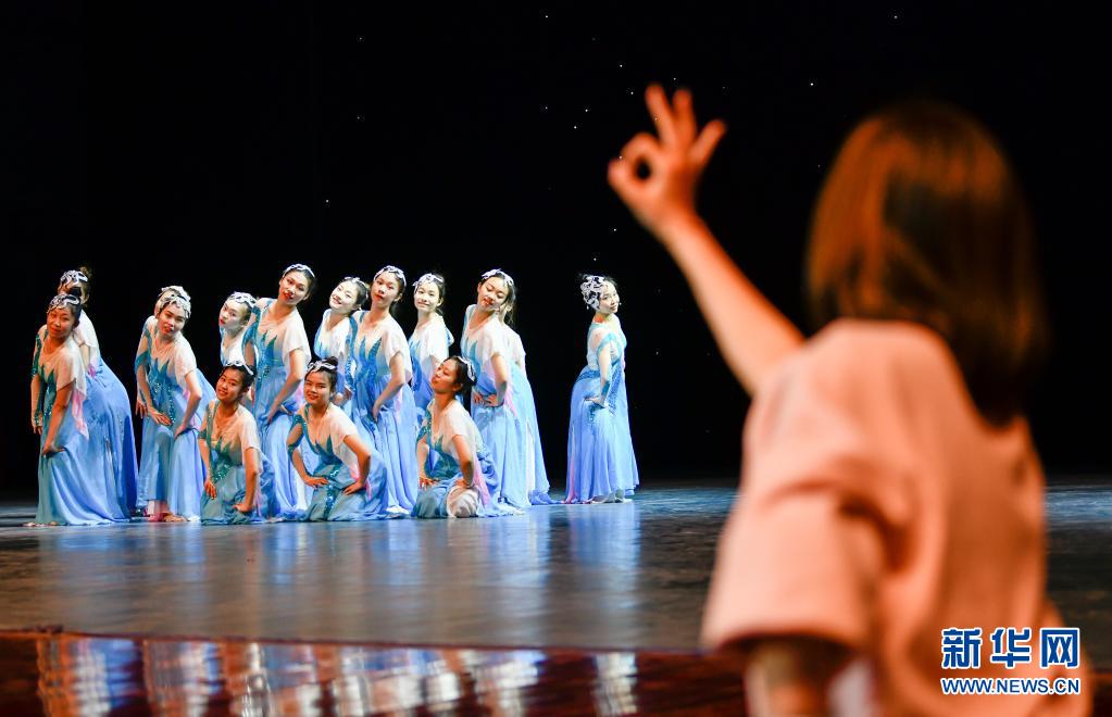 在天津理工大學的劇場里,天津市殘疾人文藝體育訓練指導中心舞蹈老師韓菲用手語為學生指揮(5月10日攝)。新華社發(孫凡越攝)