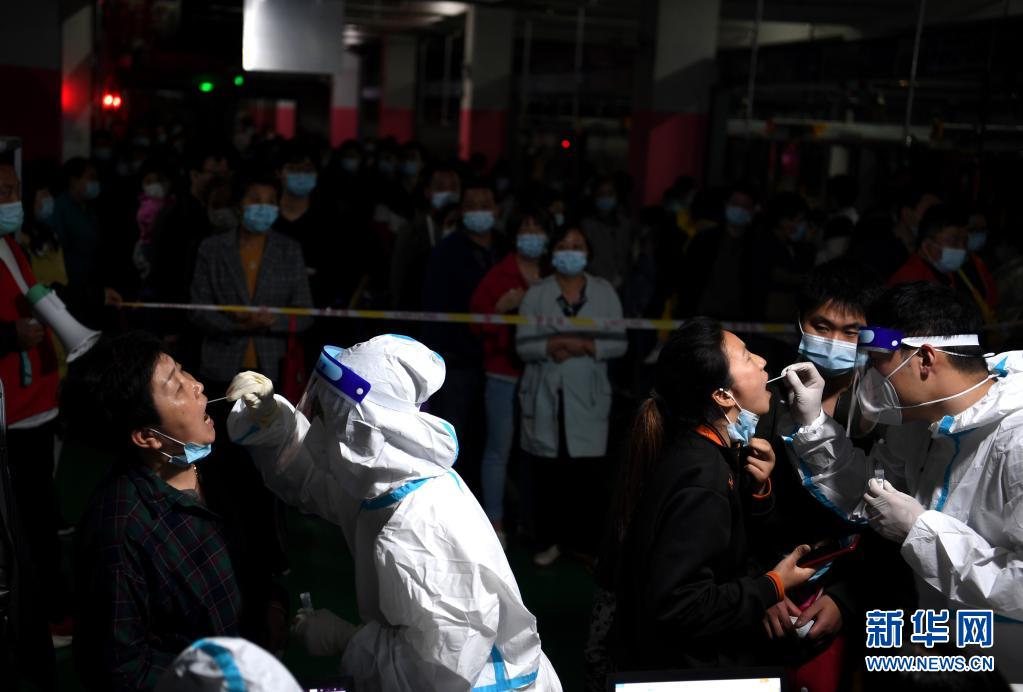 5月16日晚,在肥西縣上派鎮(zhèn)一小區(qū),工作人員為居民進行核酸采樣。